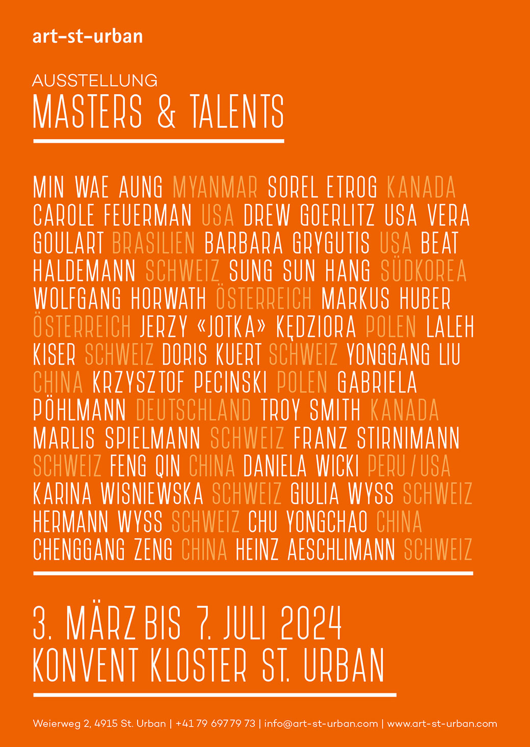 art-st-urban präsentiert in der Ausstellung «Masters & Talents» 27 Künstler aus 11 Ländern. Zu sehen sind Werke von Künstlern aus dem Kunstzentrum art-st-urban und aus dem Förderprogramm «Young Artists in Residence», die in den vergangenen 20 Jahren entstanden sind.