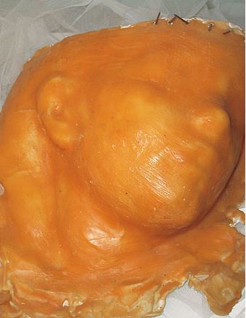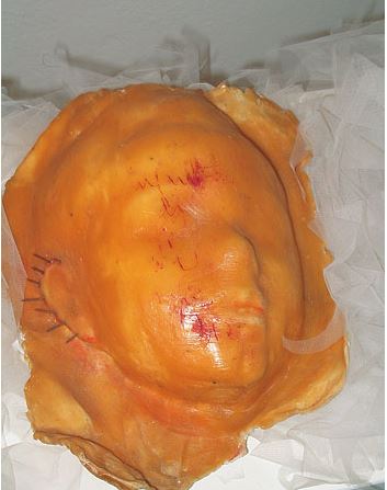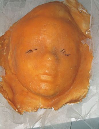Vor allem vier Masken, die auf einer Ebene von weissem Tüll als Symbol für Reinheit liegen und von ins Wachs verarbeiteten Nägeln durchbohrt sind, die jeweils in Höhe der Augen, des Mundes, der Ohren und um die Stirn hineingeschlagen sind, und so eine wirkliche Dornenkrone bilden. So symbolisiert die Künstlerin durch eine indirekte, aber deswegen nicht weniger unauslöschliche Gewalt, geschändete Unschuld.