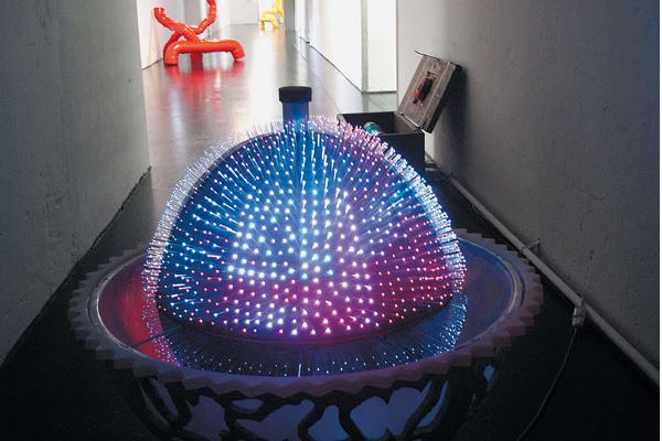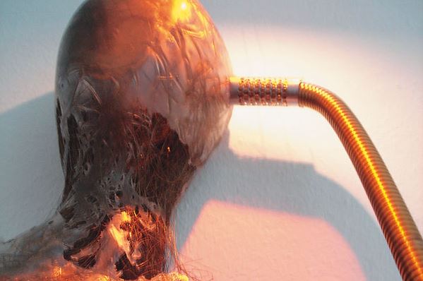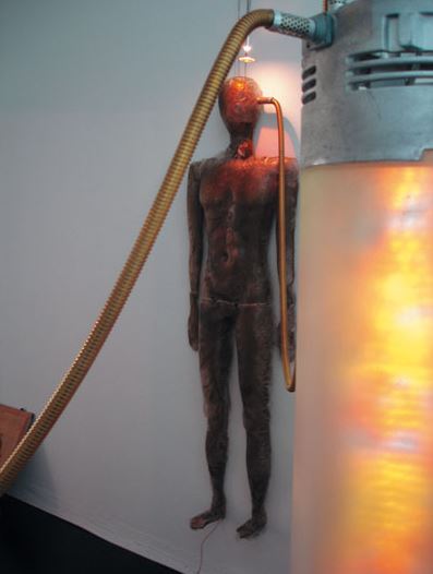 Eine menschliche Figur ist in zwei Hälften geteilt, dann links und rechts an die Wand montiert. Über Kabel und Schläuche sind sie an eine Lichtsäule und an einen auf dem Boden stehenden Holzkasten angeschlossen. Die Vernetzung von Figur und Apparat evoziert Gedanken an die post-biologische Zukunft des Menschen und an die künstliche Welt des Cyborg, wären da nicht die Schaltgeräte in den Holzkästen, die fast nostalgisch in eine vergangene Zeit zurückverweisen.