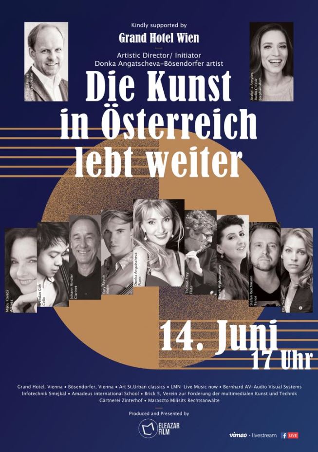 art-st-urban classic unterstützt die grossartige Initiative der Pianistin Donka Angatscheva die «Corona Stille» in Kunst und Musik mit einem fulminanten Konzert zu durchbrechen. Sie konnte einige namhafte Musikerfreunde und Künstler überzeugen, gemeinsam im legendären Ballsaal des Grand Hotel Wien ein virtuelles Konzert darzubieten, für die Musikfreunde von Nah und Fern.